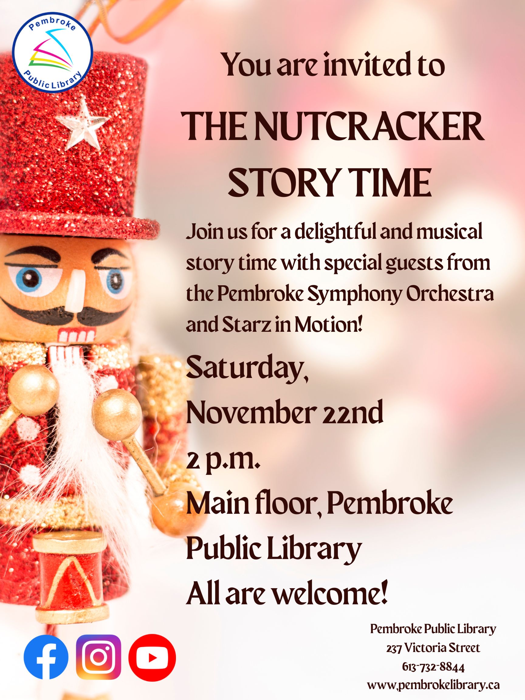 Join us for a heartwarming holiday celebration next Saturday, November 22nd, at 2pm, featuring a very special Nutcracker Story Time with enchanting performances featuring guest musicians from the Pembroke Symphony Orchestra and graceful ballerinas from Starz in Motion. The all-ages event will take place on the main floor of the Library and is free to all.