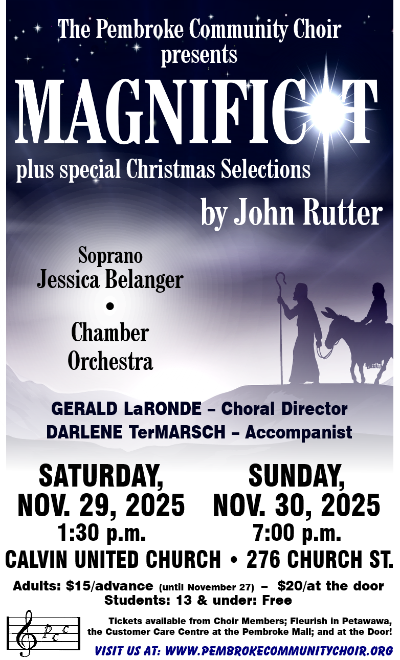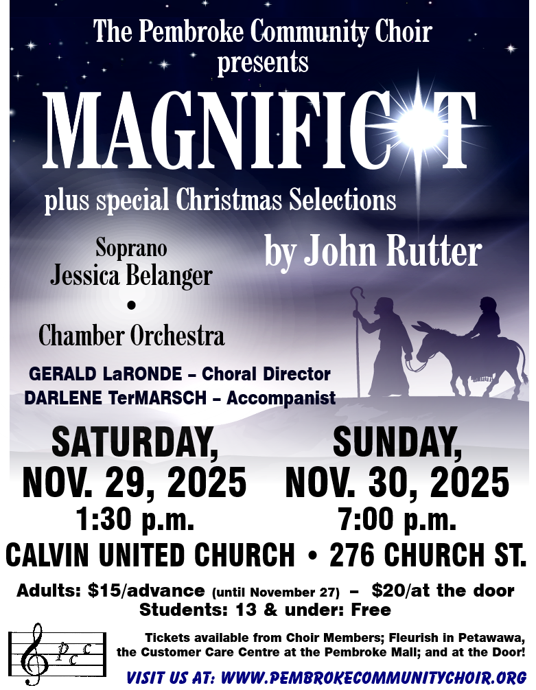 The Pembroke Community Choir presents "Magnificat Plus Special Christmas Selections by John Rutter". There will be an afternoon concert on Saturday November 29 at 1:30pm, and an evening performance on Sunday November 30 at 7pm at Calvin United Church, in Pembroke. Tickets are available at Fleurish in Petawawa, the Customer Care Centre at the Pembroke Mall, and from Choir members for just $15. Tickets purchased at the door are $20. Students 13 and under are Free! Visit https://pembrokecommunitychoir.org/ for more information.