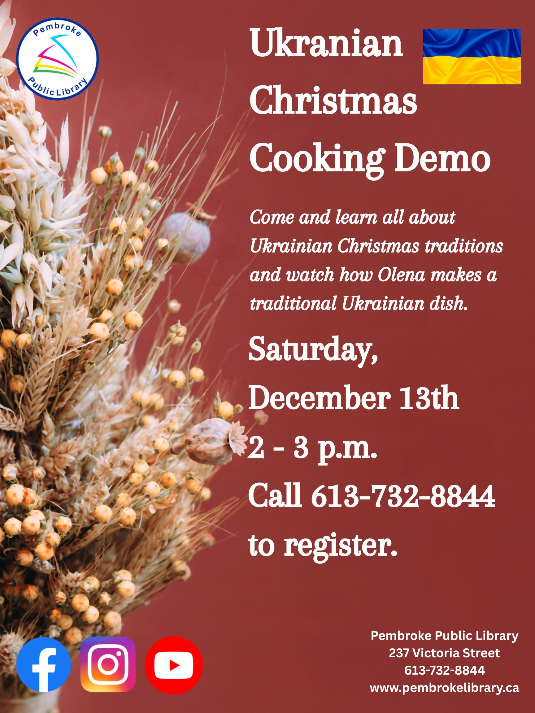 Come learn all about Ukrainian Christmas traditions and food, through this live Cooking Demo by Olena Kasaraba. Call 613-732-8844 to register.